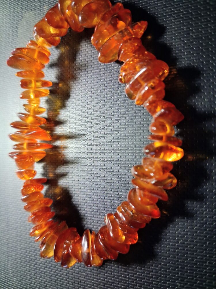Bracelet en perles de 0.5 x 1 centimètre d’Ambre cognac de la Baltique montées sur élastique et de diamètre standard.