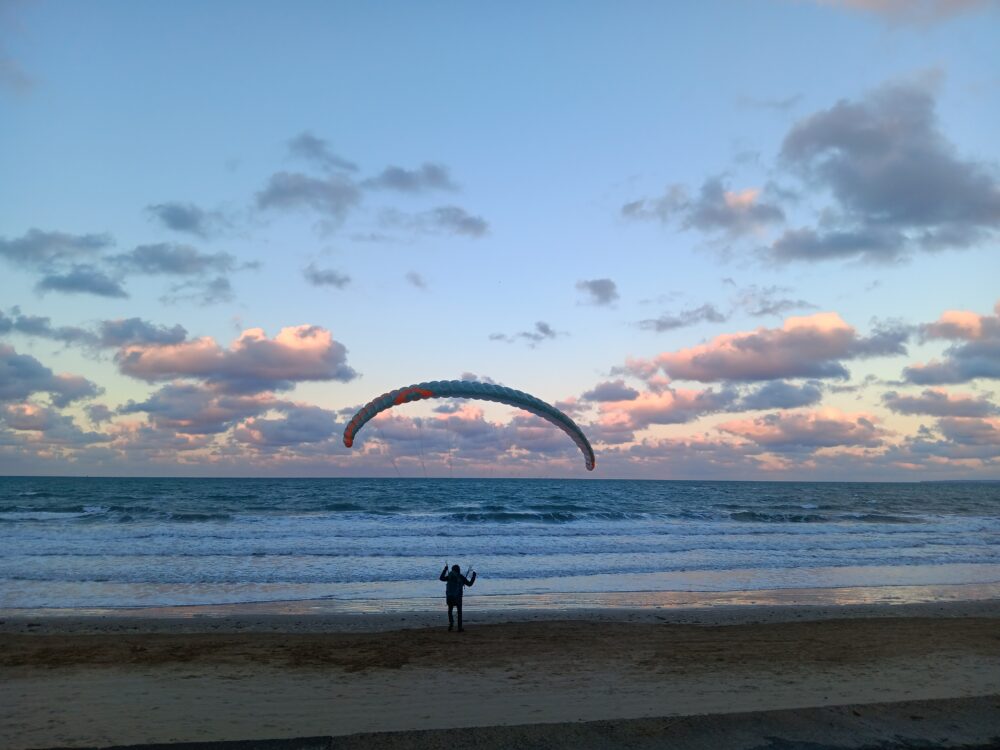 « L’envol » est une photo prise sur la plage de s Rosaires à Plérin en fin de journée d’automne face à la mer par grand vent avec un beau ciel nuageux mais prenant les couleurs du coucher de soleil. Au premier plan un homme relié à une voile jouant avec le vent et qui cherche l’envol..